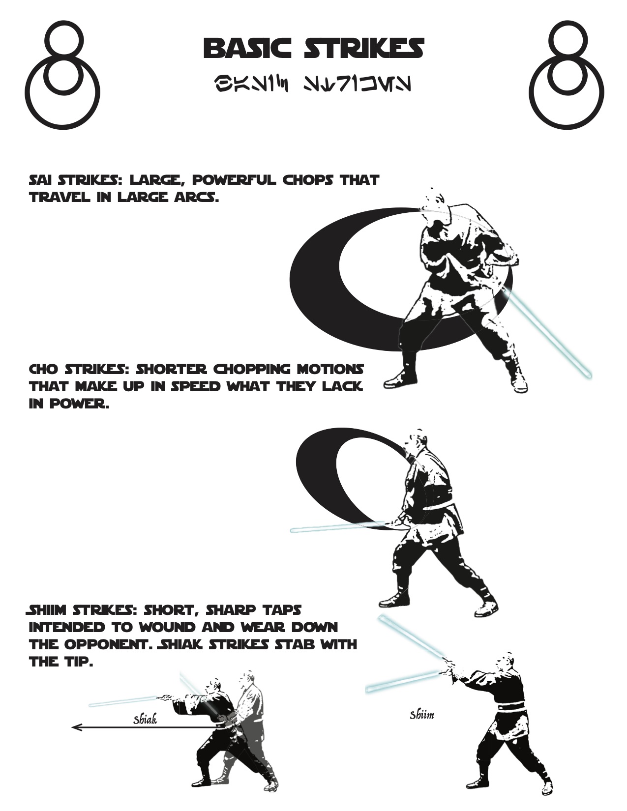 Sai: This is a full amplitude strike with a follow through. The strike is powered by the body and also propels the body forward. The combination of these two forces allows one to completely slash through a target. Contrary to popular belief, lightsabers do not cut through everything equally. There is a requisite amount of inertia that must be built up in the blade. Sai is this method.