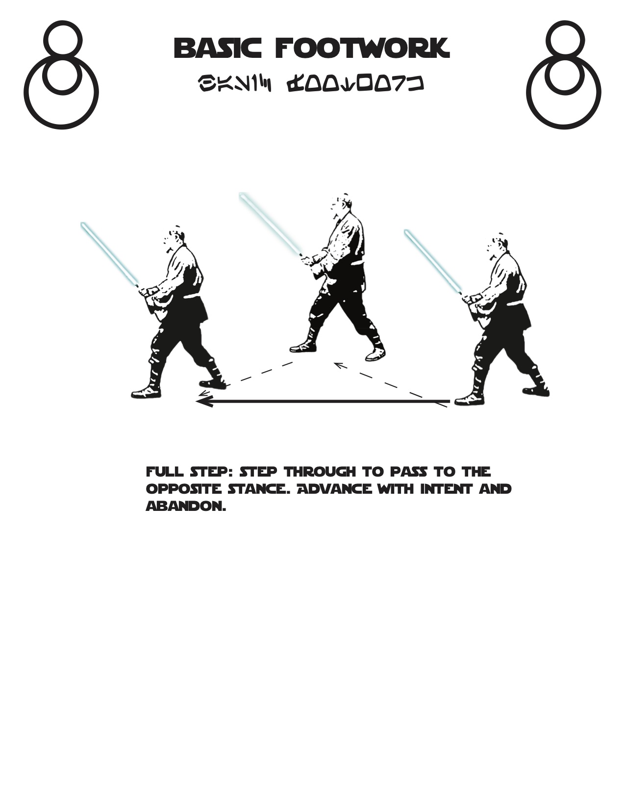 A full step is a total change in stance. Since in saber combat we keep our stance in line, one of our lower zones is always forward or back. When switching between defense and attack, the back foot become the front foot by passing right next to the other. This allows the leg to pass naturally through to the other side and is the quickest way to travel over distance.