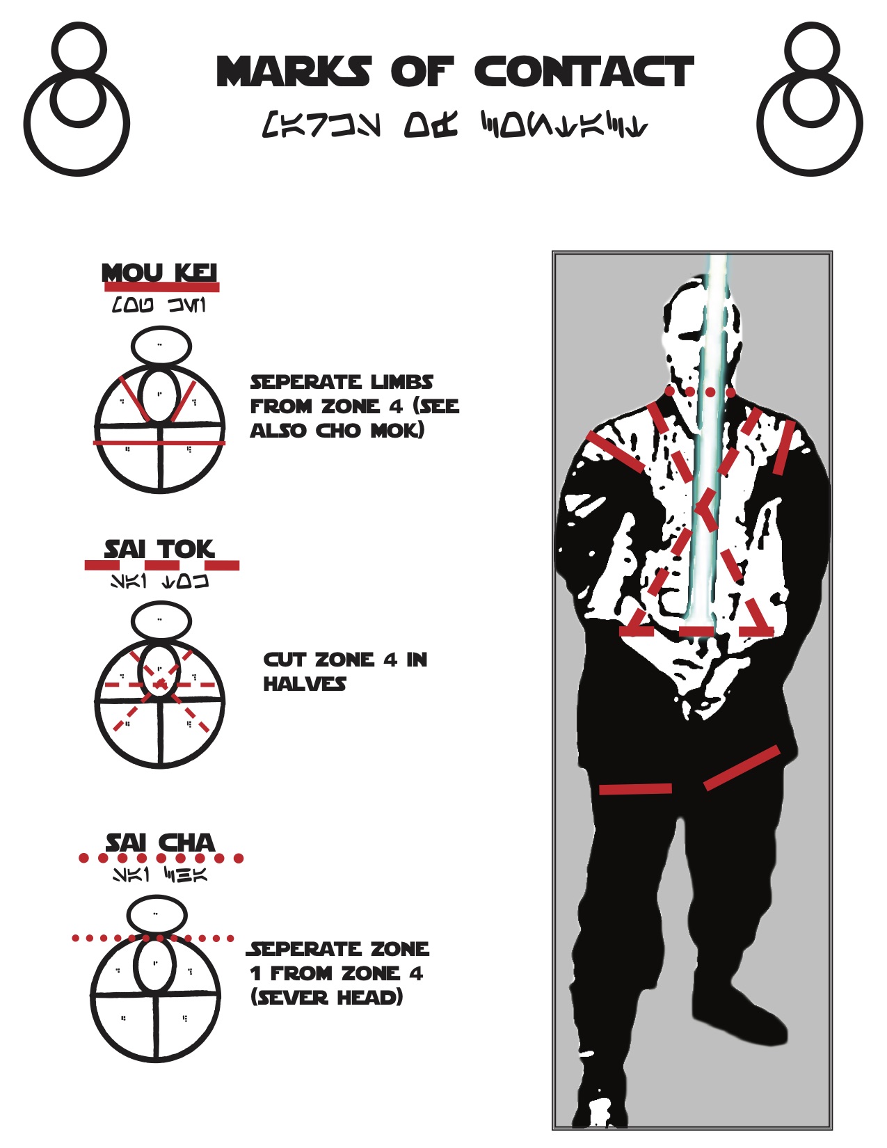 The Marks are categorized into their various strike families. Marks that require a sai strike are separate than those for cho, etc. Not only is this a convenient way to organize them, it can train the natural reaction of power and technique at the same times as targeting. Meaning, that when I target the body thinking of Sai Tok, my body and weapon are already making preparations for the full amplitude strike needed to go through a torso.