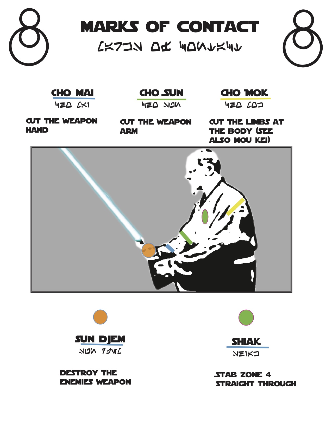 Cho sun is an interesting Mark. Attacking the joint can truly be any joint in any limb. Over time it has changed to mean exclusively the weapon arm at the elbow. Many of the Marks of contact, while associated and formulated in Shii-Cho, many of the changes in their application are a direct result of later adaptation from Makashi. Since in a one on one duel, it is most common to have the zone 2 arm as the primary target. But the Mark it’s self originally referred to any joint in any limb.