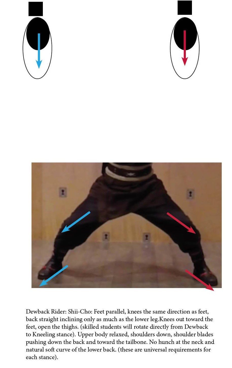From Dewback rider angle one foot out about 45 degrees. Straighten the opposite leg so that your weight sinks onto the turned out foot. This is now your front leg. Twist the hips and feet to reverse the stance to the other side. The power comes from the shift and the straightening of the back leg as it pushes you to the side. This position is used for lunges and many front weighted techniques as well as being a great training stance.