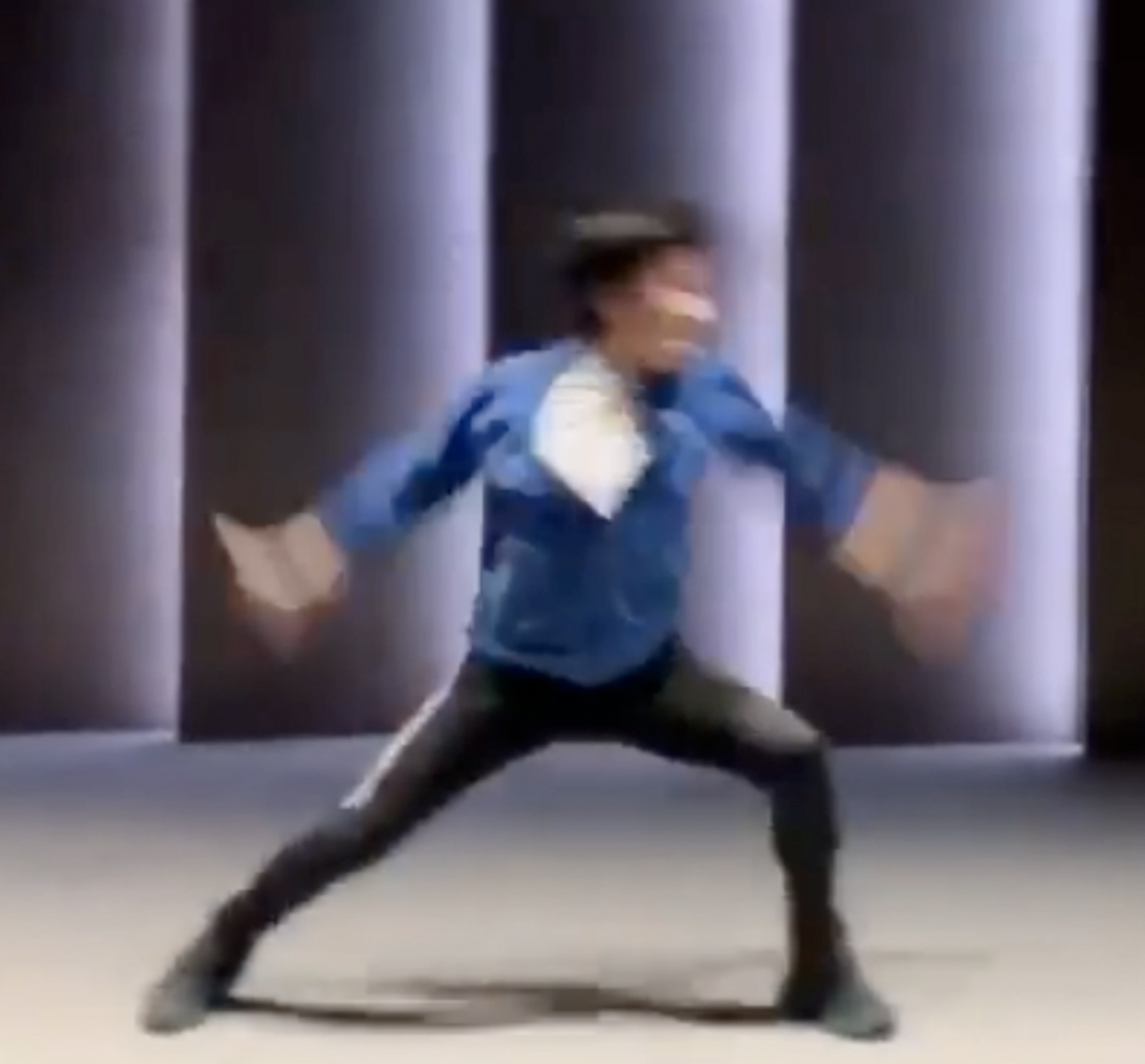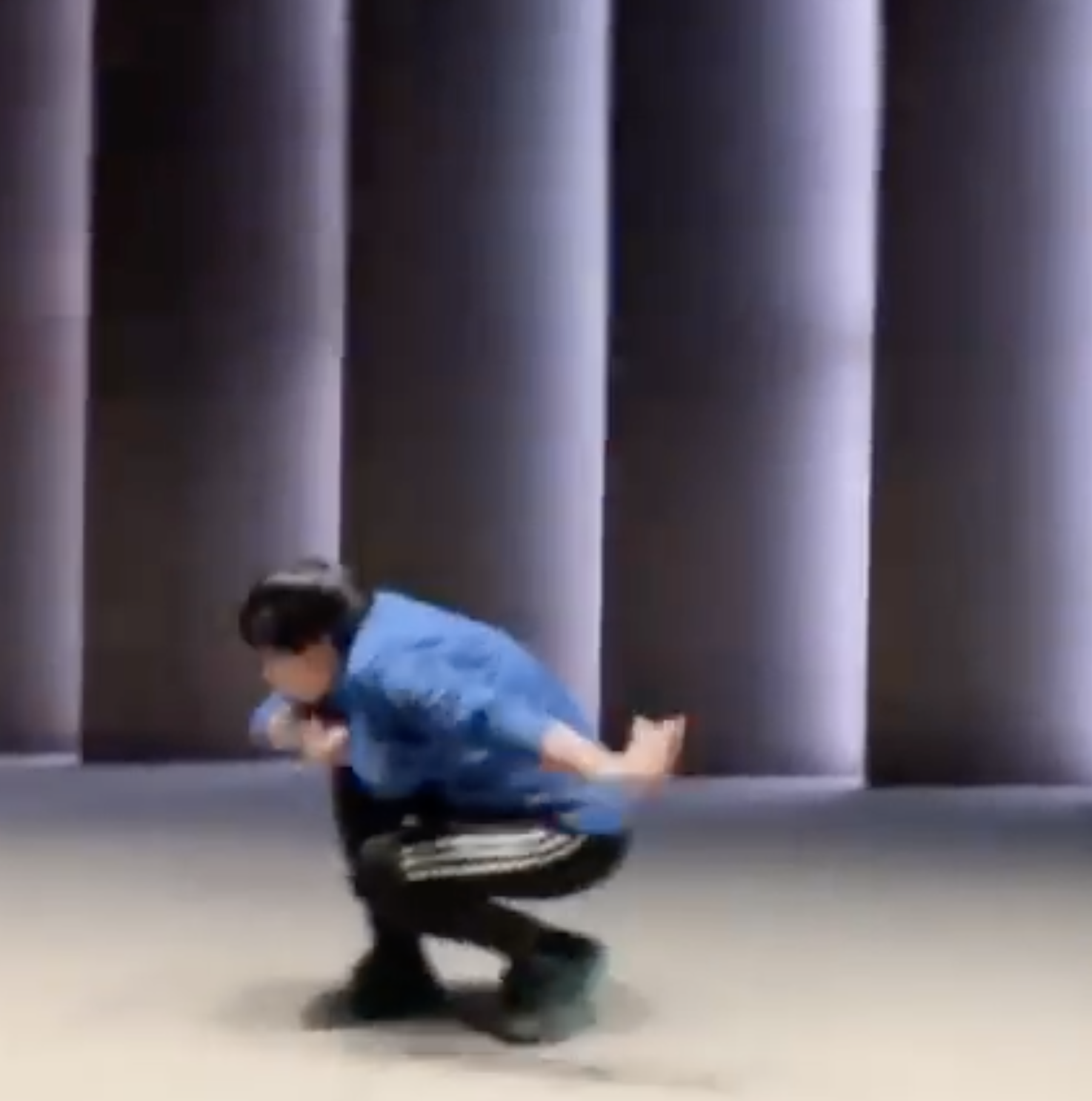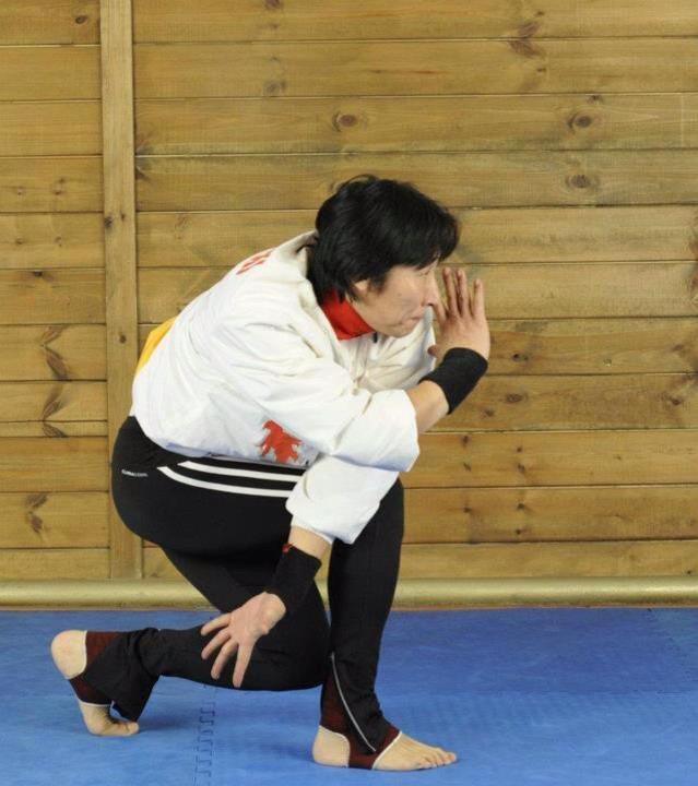 The sequence begins with the partitioner standing in ready position feet together, arms at the sides. After the opening movement, take a step to the right while the arms rise up laterally. The body turns to the right and the action “gun bei”滾背 or “roll the back” is performed. The end position for gun bei is a low squat, the majority of the weight on the right foot, and the left arm trailing behind. The torso turns to the extreme right, hence turning the back, on the imaginary opponent.