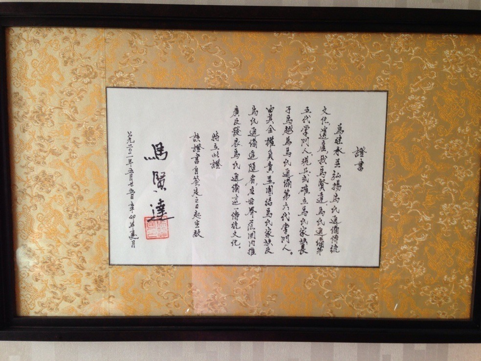 May 2011 in Xian, Master Ma Yue was officially awarded the 6th Generation Headmastership of the Ma Family Tongbei Martial Arts System by Grandmaster Ma Xianda (One of the top 3 experts of Chinese Wushu, Ten Great National Professors of Wushu, holder of 9 Duan – The highest ranking of the National Wushu Duanwei System)—
