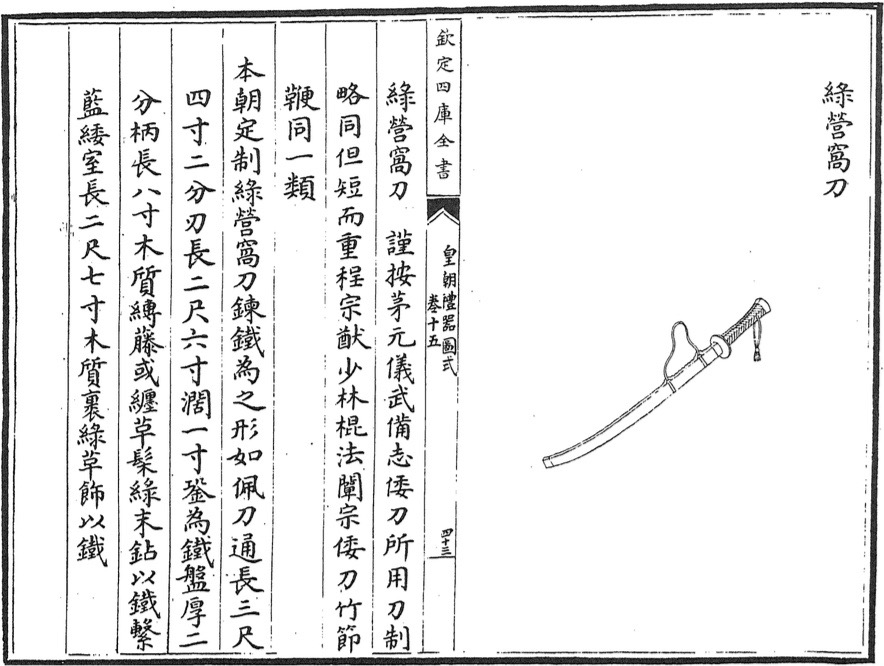 The scabbard is 2 chi 7 cun long, made of wood that is covered with green leather. It has iron fittings.”