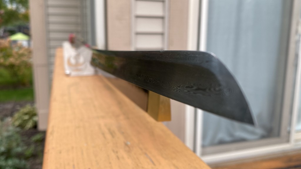 The sword is fairly robust in nature. Although it looks very slender and elegant, holding it reveals a chopping a slicing machine. The recurve adds some heft to the front part of the blade but in a way where it feels as though the sword is trying to cut by its self. The spine is thick and has a gradual taper. The hollow grind down the length of the blade gives it an “I beam” structure, excellent for strength and flexibility of the blade. It cuts through bottles without any resistance. Even on bad cuts where the edge is off or the blade turns in the hand, the combination of the sharpness and the cross section seem to be able to make short work of anything a bottle can offer. The larger targets were a bit more difficult, but once I found the correct angles, the sword passed through with not much more than a satisfying “pop”.