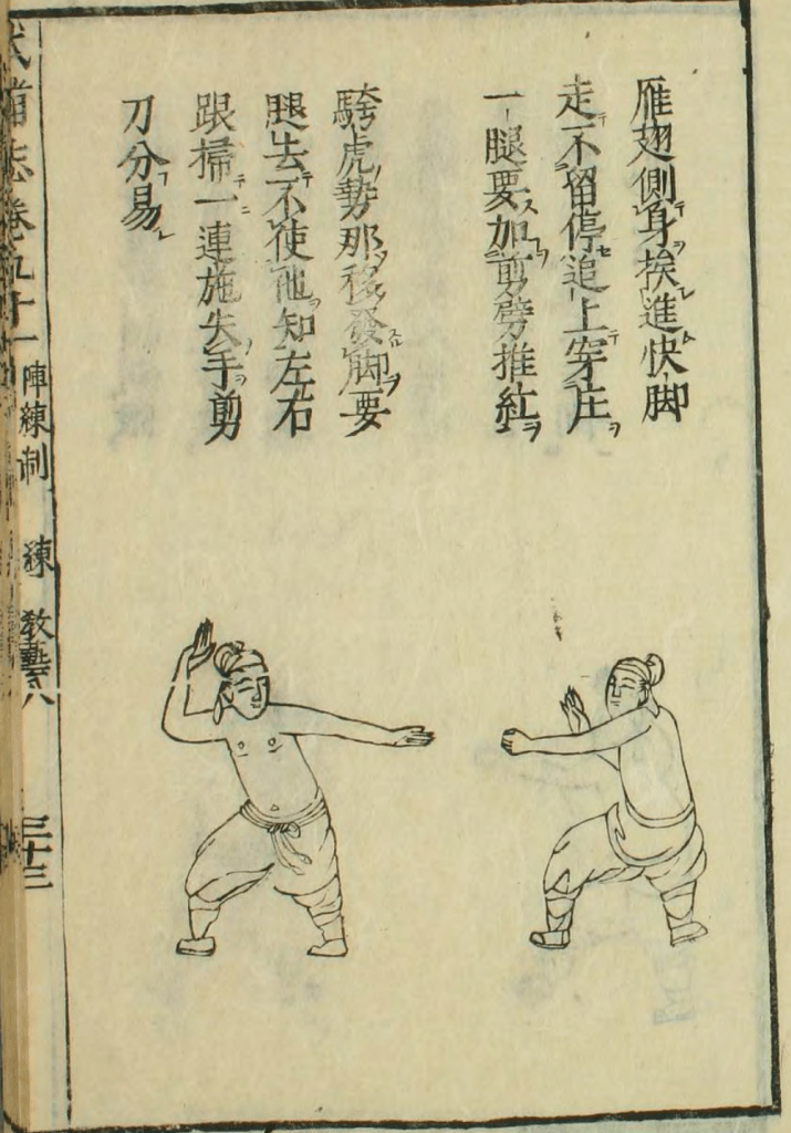 I have also reformatted the translation to be easier to read. Each page in the Wubei Zhi has two stances represented on it. The texts is read right to left and the translations correspond to the side of the page that is being translated. Hopefully this will be easier and more accessible than my previous attempt.