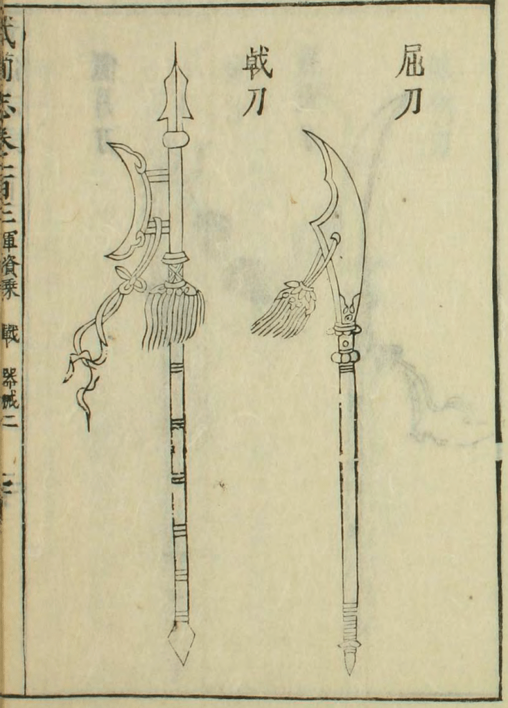 The weapon it’s self consists of four main components: The shaft or handle, the blade, and the two brass ends that will cap the handle at each ends. The Brass cap for the bottom of the shaft is larger and has significant heft to it. At least the reproduction does. The other end is smaller and contains the slot which the blade will fit through. The shafts can be of a variety of lengths, from 3-4 feet (1 meter) to a battalion length ji which will come in at about 9 feet total length. Usually the longer the pole, the smaller the blade head, for obvious reasons. There are a great many sizes for Ji blades found, but they are all fairly standard in their dimensions.