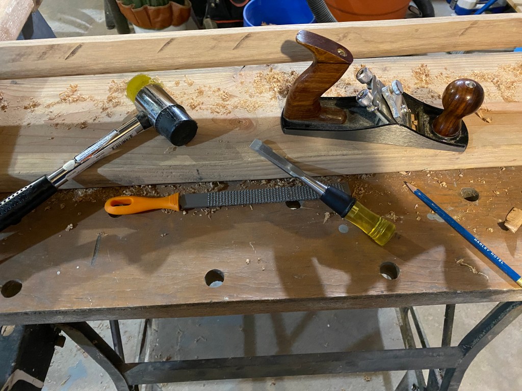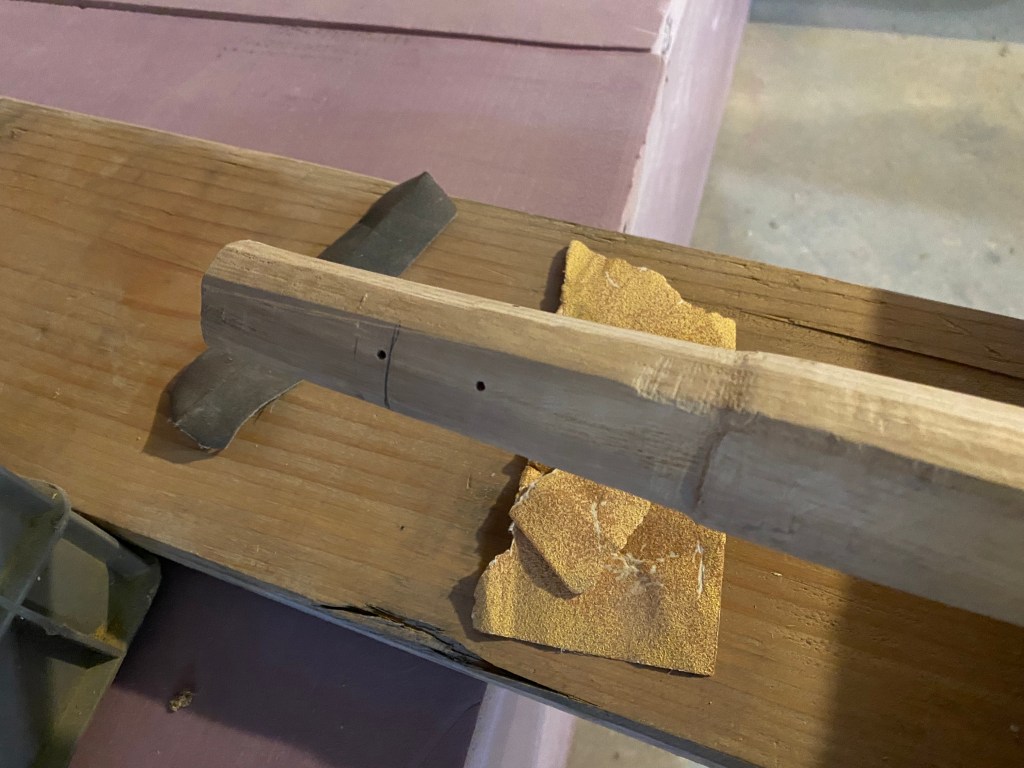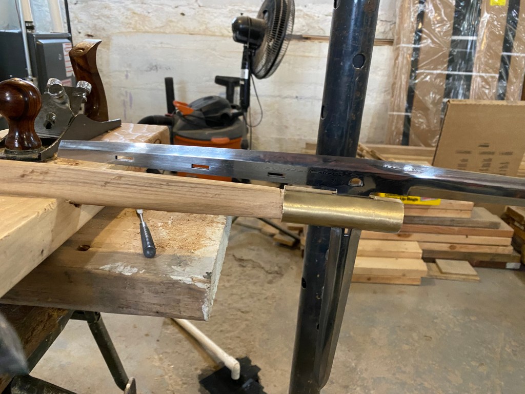 For the ends where the brass caps fit, we started using files and sanding. This gave the results we wanted but again was very laborious. After a time, we discovered the a simple hammer and chisel technique can rough out a shape in a fraction of the time, and a spoke shave can finish it off with ease. We wanted to pressure fit these ends and make sure they were very secure, so the shape of the wood end is critical. It takes a bit of focus, but we are able to fit these ends well and they are terribly to difficult to get off (as we found out when we had to remove one that was only half on at the time). The pressure fit is tight and gives no rattle or slipping.
