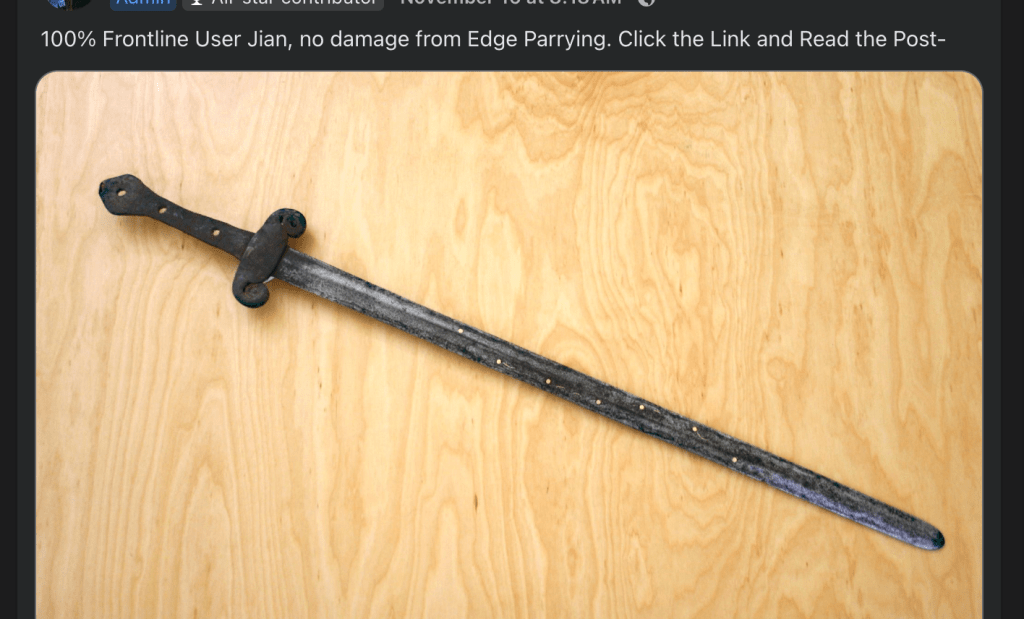 (A comment on the above picture) “NOTE: There is No Evidence of Edge on Edge Parrying on this Blade. No one has presented even a single example of a Chinese sword with edge damage indicative of edge parrying.